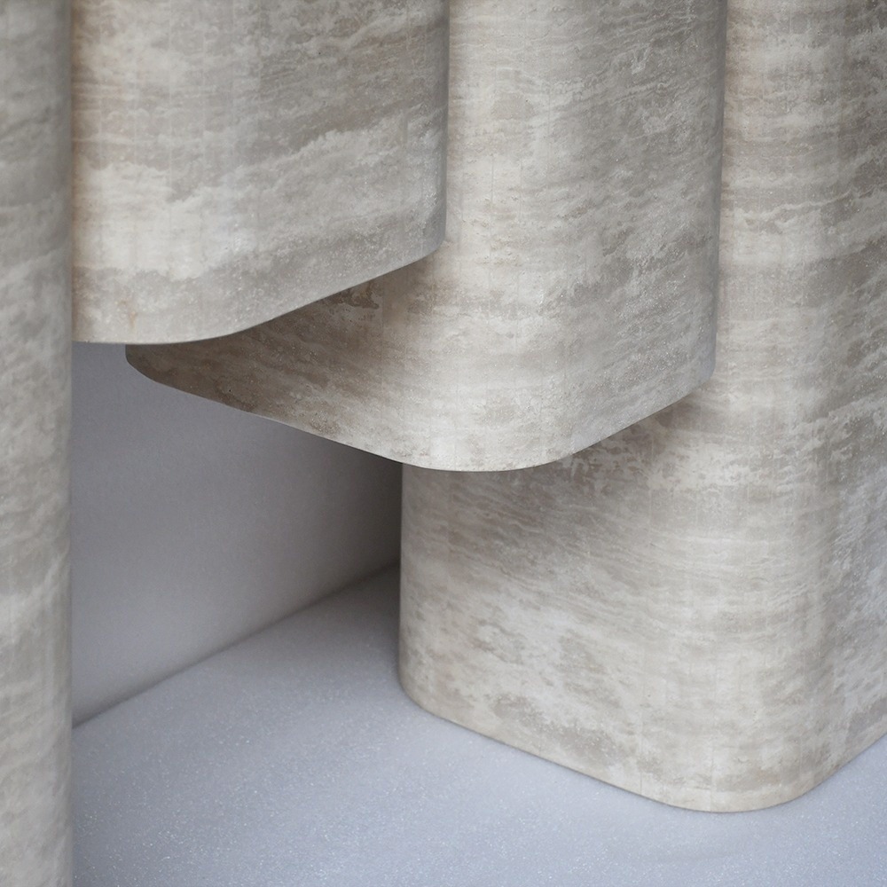 The table’s defining feature is its striking stepped, layered frame: a series of recessed, nested rectangular cutouts run along the underside of the tabletop and down the vertical legs, creating a rhythmic, three-dimensional architectural silhouette. Fluted vertical edges on the outer legs amplify the textural depth, turning a functional support into a sculptural work of art that plays with light and shadow.