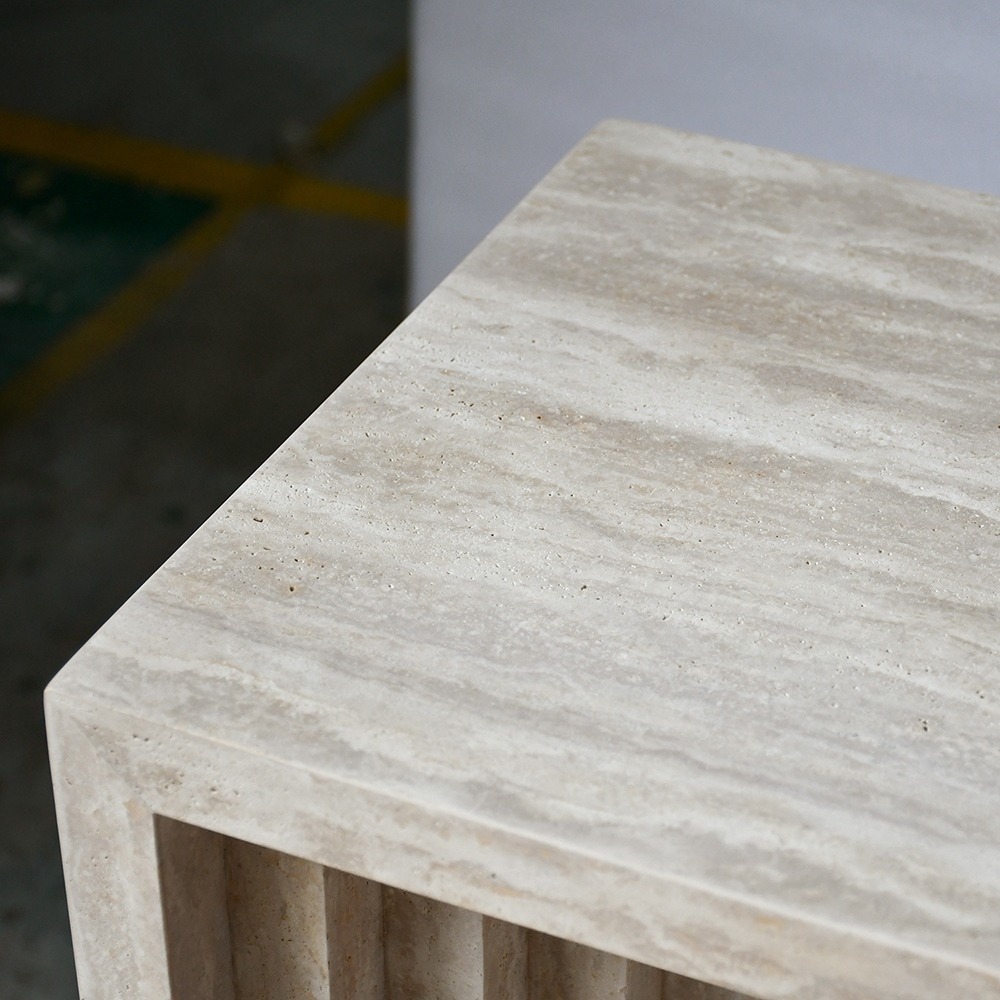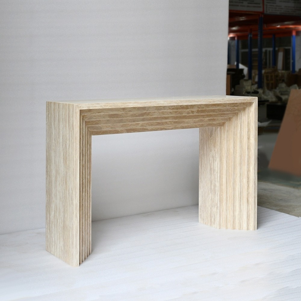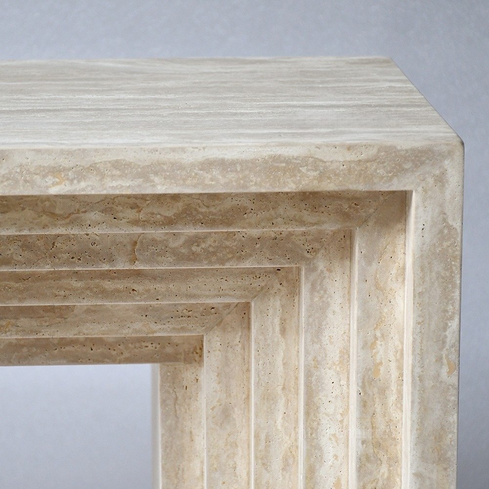 The table’s defining feature is its striking stepped, layered frame: a series of recessed, nested rectangular cutouts run along the underside of the tabletop and down the vertical legs, creating a rhythmic, three-dimensional architectural silhouette. Fluted vertical edges on the outer legs amplify the textural depth, turning a functional support into a sculptural work of art that plays with light and shadow.